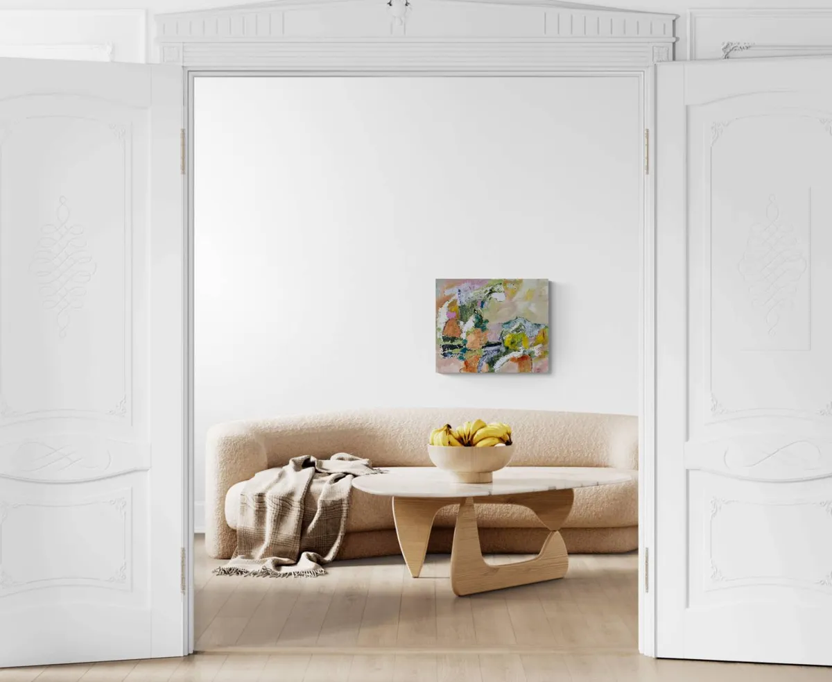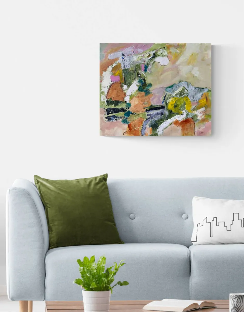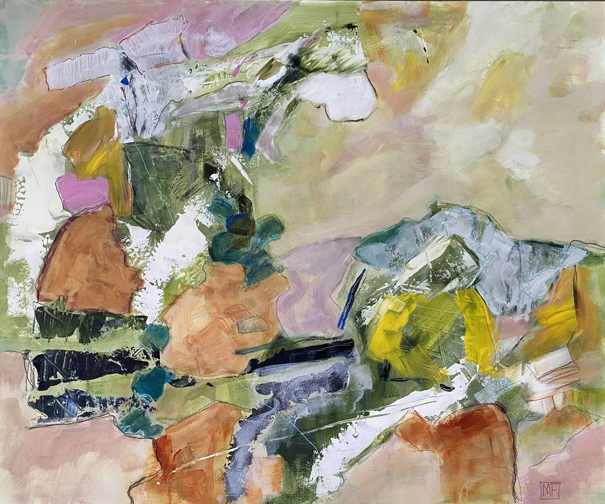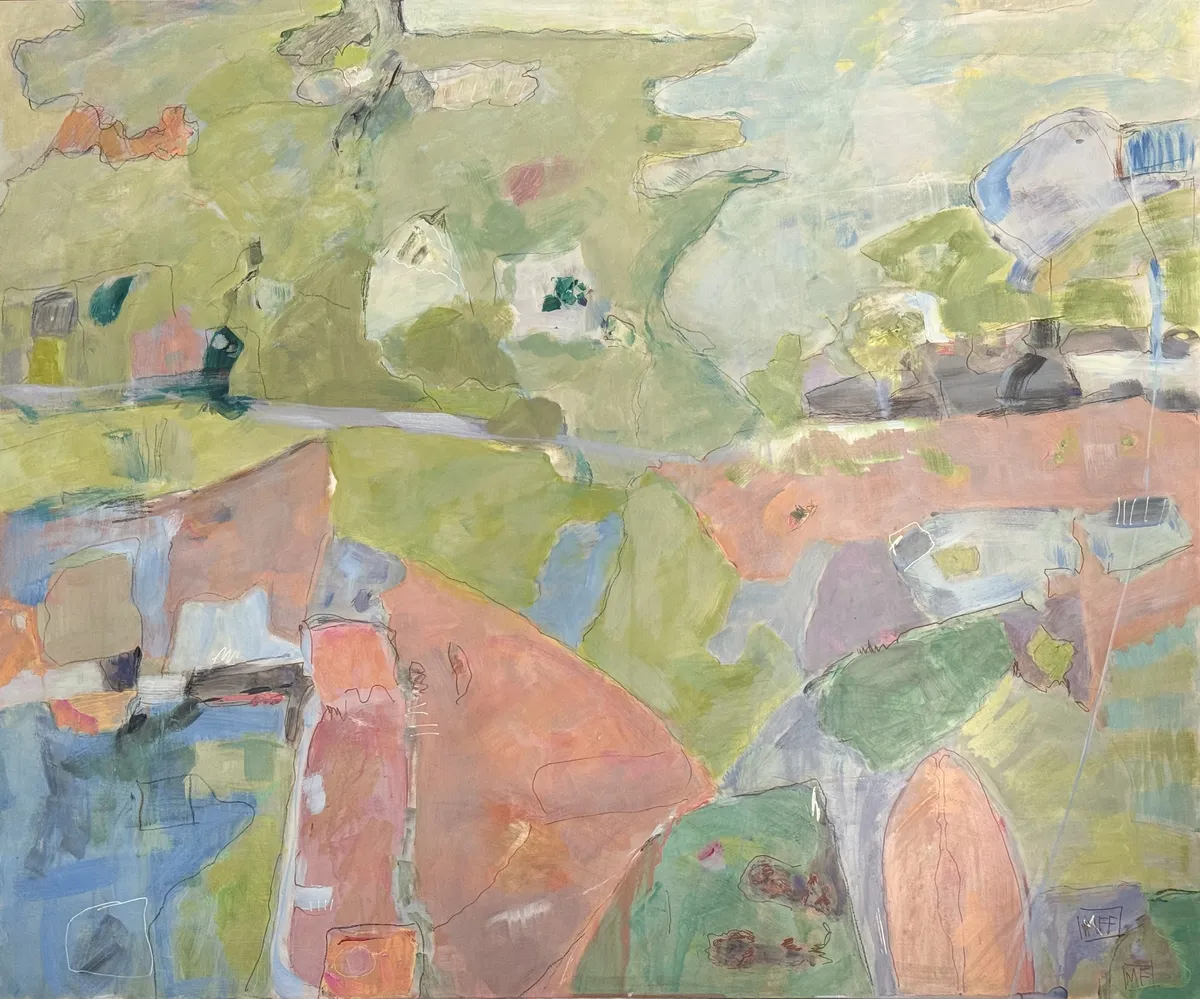This acrylic painting, accented with china pen, on cradled board explores the interplay between memory and place, drawing inspiration from time spent in Arashiyama, outside Kyoto. Known for its bamboo groves, forested mountains, and cultural landmarks like temples, shrines, and villages, Arashiyama exists at the intersection of nature and human presence—a duality I wanted to explore through abstraction. It was awarded Honorable Mention Teravarna 10th Open Art Competition. Using a soft, layered palette of greens, muted pastels, and earth tones, the work avoids literal representation, instead emphasizing the fluidity of memory and how we reconstruct landscapes in our minds. The addition of china pen linework introduces dynamic, gestural marks that suggest pathways, boundaries, and fleeting details, speaking to the fragmented, layered way we experience and remember spaces. This painting aligns with a contemporary focus on the relationship between environment and human intervention, questioning the boundaries between natural and cultural landscapes. The abstracted forms and interconnected shapes invite viewers to navigate the work as they would a map—imagining their own movement through the space. Ultimately, the piece examines how personal and collective histories inform our connection to landscapes, offering a space for reflection on the coexistence of tradition, nature, and modern life.
